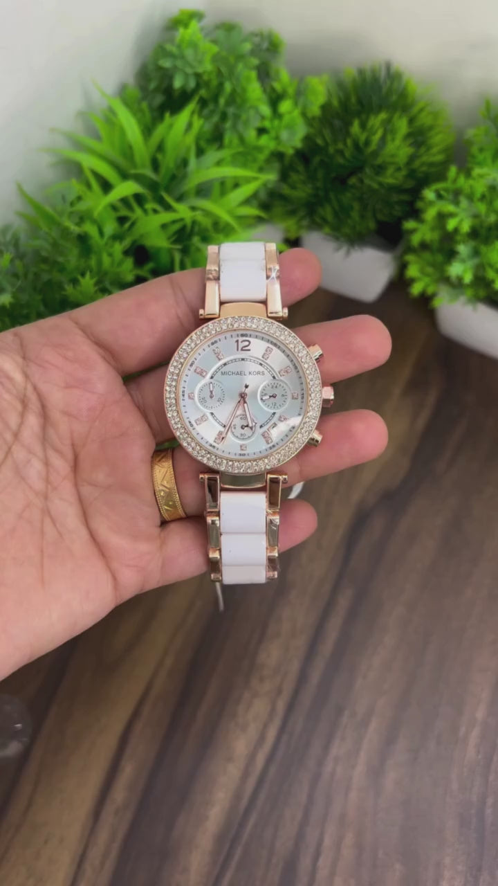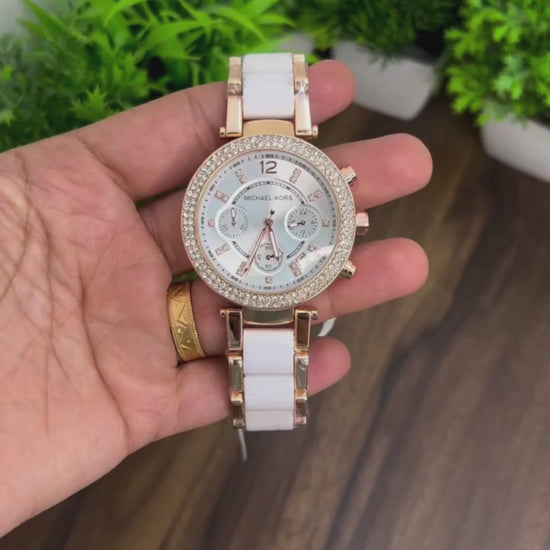 Elevate your elegance with the Michael Kors Parker MK5774 Women’s Watch — a stunning blend of luxury and function. Designed for modern women who love a touch of glamour, this timepiece features a radiant rose gold and white ceramic band, a crystal-studded bezel, and a sleek chronograph dial. With a polished stainless steel body and premium quartz movement, this designer watch brings timeless beauty and precision to your wrist. Perfect for both everyday wear and special occasions, the Parker MK5774 adds effortless sophistication to any outfit.