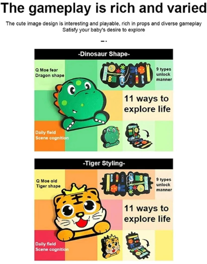 Features: Our activity sensory board includes 11 different parts (zippers, shoelaces, buttons, buckles etc), which can exercise children's various fine motor skills, basic dress skills, hand-eye coordination, focusing mind, logical thinking and so on. This baby busy board is made of high quality felted wool, soft with no hard corners, no harm to the skin and no peculiar smell. Every component on the busy board is well-made and sturdy. The activity board is a perfect travel toy, your kids can take it anywhere easily for its lightweight and handbag design. The Montessori busy board is very suitable for parents to give your children as a birthday or Christmas gift. Specifications: Name: Kids Basic Skills Learning Board Material: high quality Felted wool Size: about 35*25*2.8cm Washing method: hand washable and machine washable Packing List: 1* Busy Board for Toddlers Warm Tips: As there are some small parts in the busy board, we suggest children under the age of three play this busy board under the supervision of parents.